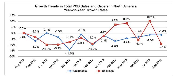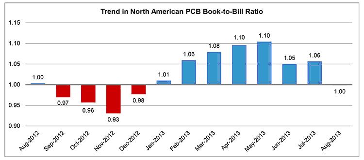 2013年8月份北美地區(qū)PCB行業(yè)的出貨量,同比下降1.6%,訂單量同比下降9.1%。年初至今,PCB行業(yè)出貨量與去年相比,下降3.9%,訂單量下降1.0%。與上月相比,8月份PCB行業(yè)的出貨量環(huán)比上升5.3%,而訂單量環(huán)比下降8.1%。8月份的出貨量超過訂單量,把訂單出貨比拉低到1.00。