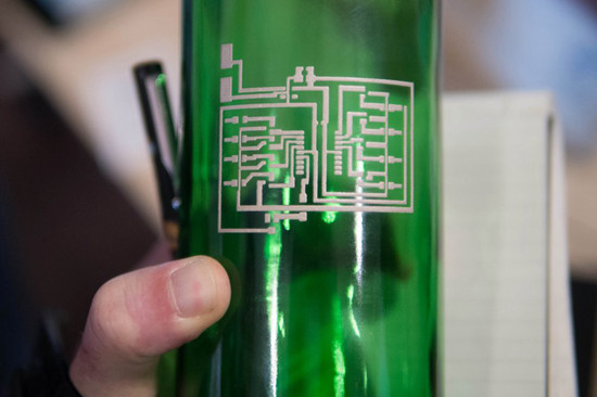 上圖中的產品來自于一家名字聽起來略微有點沒想象力的公司:Printed Electrics(打印電子元件)。這家公司的客戶涵蓋航天到汽車領域,圖中產品正是根據一位客戶的要求(想要擁有一種在任意3D表面皆能打印電子元件的方式)所開發的。而現在,這家公司又在試圖為這種技術尋找其他的應用方向。在展會上,這家公司為筆者展示了自己的技術:他們直接在一支酒瓶上打印出了電路、微控制器、溫度傳感器和LED。